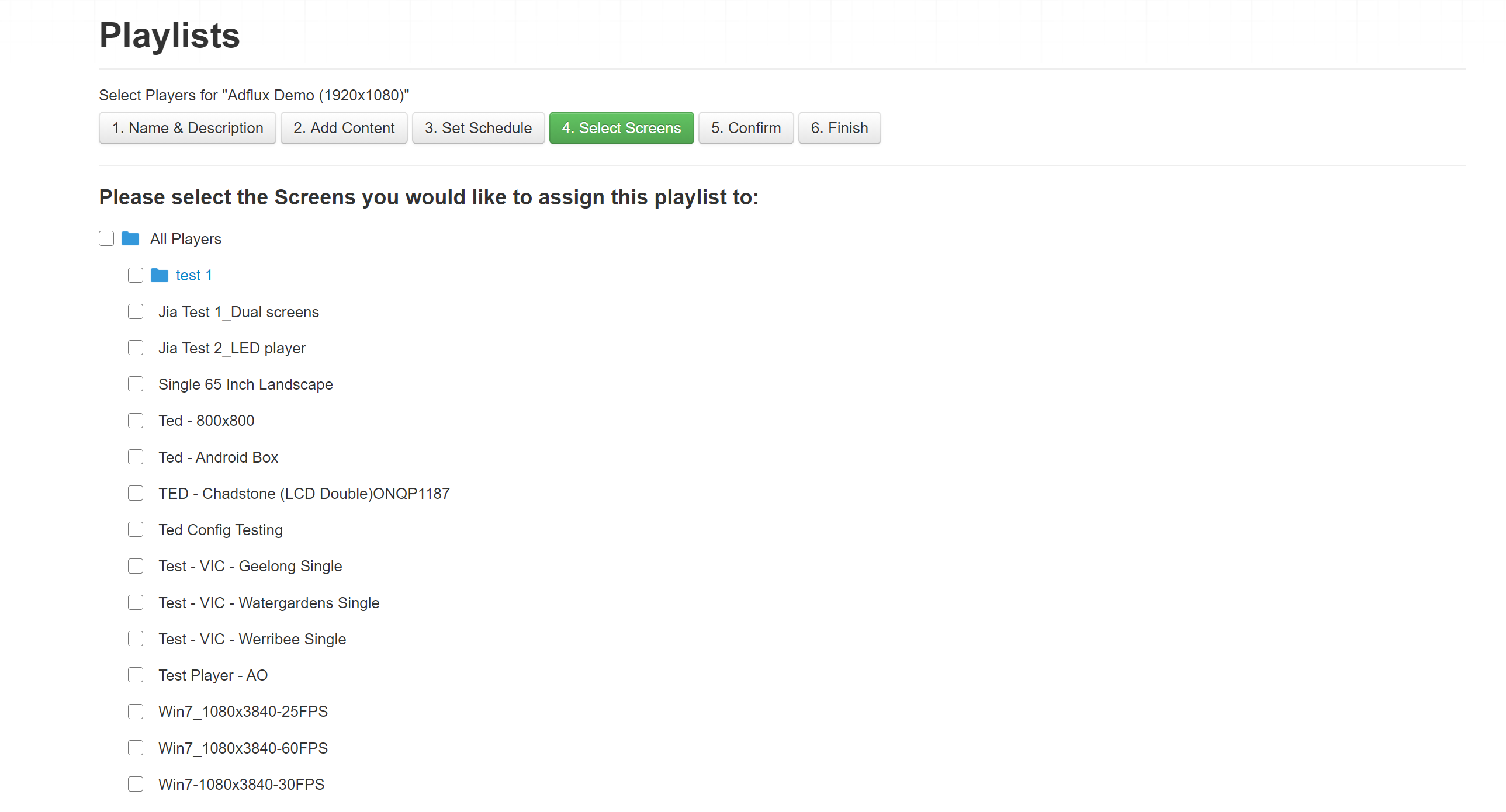 In “Playlists” tab, you choose your desired playlist, click “Select screens” and assign this playlist to a single screen or a group of screens.