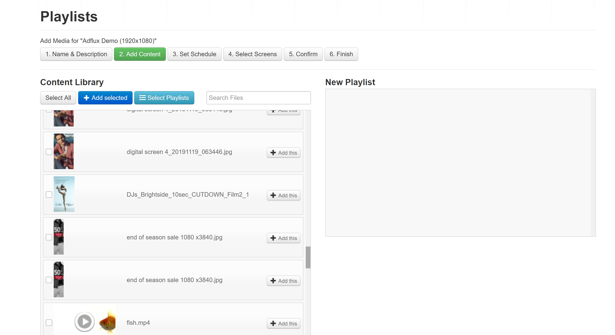 The Adflux CMS allows users to build content playlists within the digital signage software. Users can group and organize similarly themed content or content for particular occasions into a single playlist. Instead of scheduling each piece of content one-by-one, users can select a playlist and assign it to a specific screen in just a few clicks.