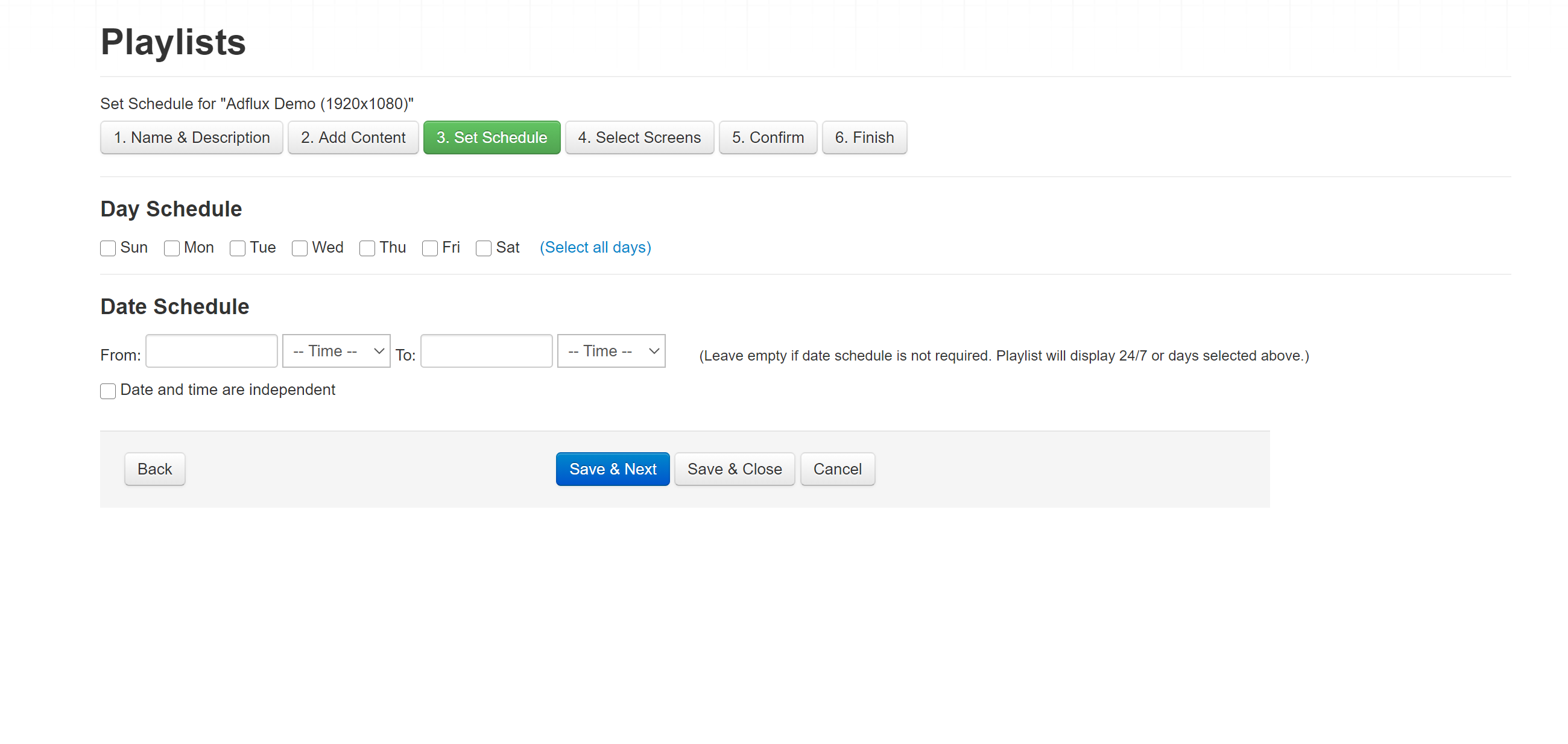 The Adflux CMS allows you to schedule digital signage content in advance. This feature is useful, as it enables users to plan a month or more worth of digital signage content in a single sitting. The user can then set-and-forget their digital signage content, and they don’t have to allocate time each day to deal with content updates.